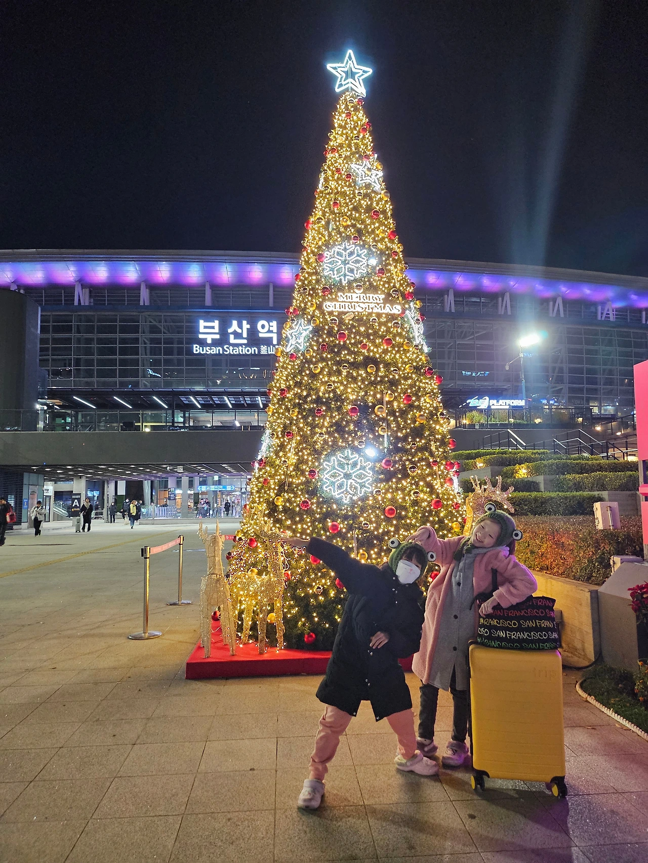 부산역 앞에는 대형 트리가 전시되어 있었다. 바로 지하철을 타고 가도 되지만 크리스마스 분위기가 주는 설렘과 부산역이라는 글자가 주는 여행의 들뜬 마음을 놓칠 수 없었다. 일 년에 네다섯 번은 오는 부산인데도 처음 오는 것 같았다. 하긴, 지금 이 나이 때 아이들과 오는 부산역은 처음이니까. 그래서 셔터에 손을 떼지 못하고 연신 너희를 담았나 보다.