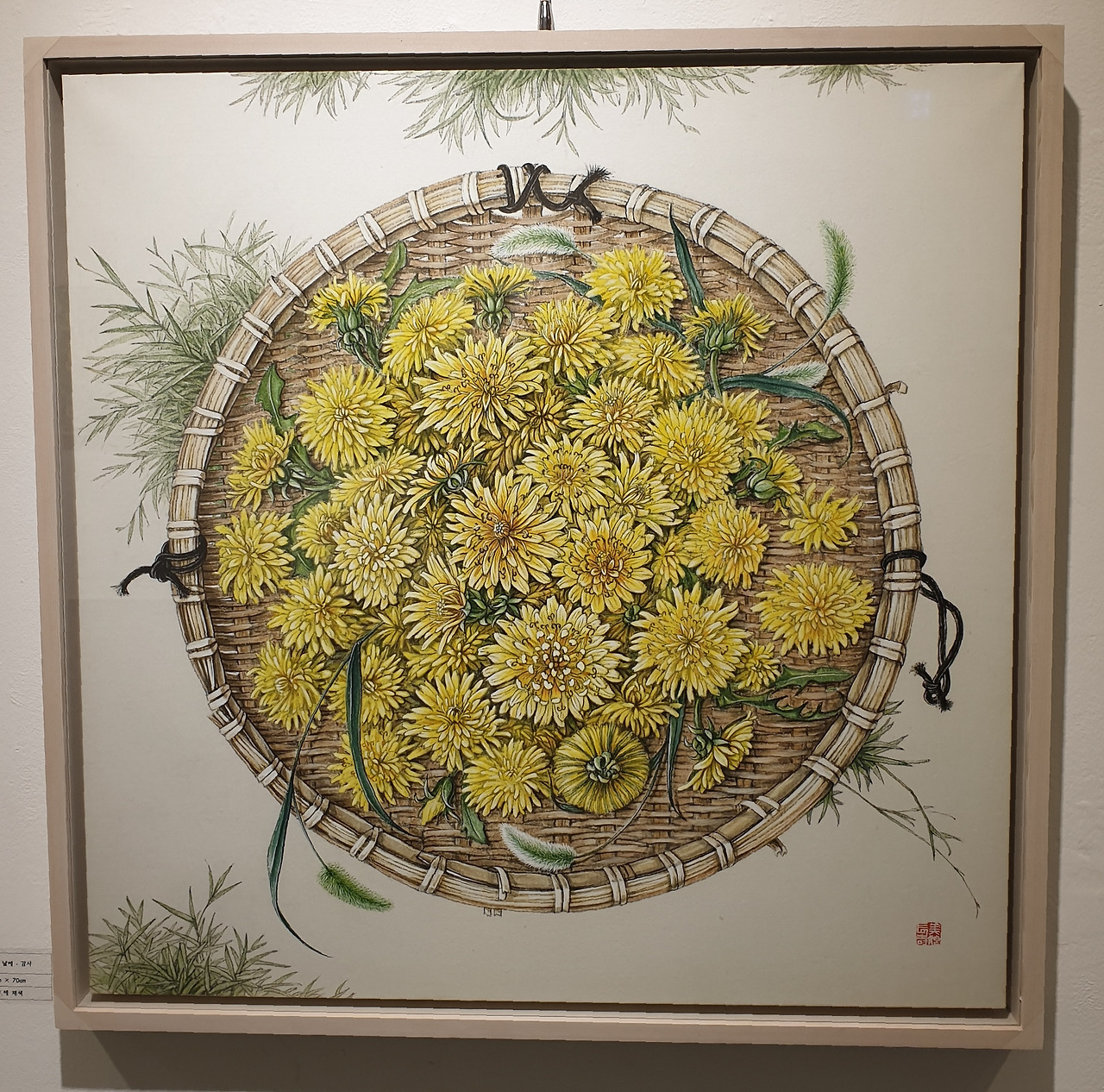 처음에는 정성껏 그렸으나 민들레가 너무 많아서 투박하게 선을 그렸다. 꼼꼼하지 못하고 성격 급한 내가 한 시간이 넘게 그림을 그리는 것은 쉬운 일이 아니었다. 새삼 먹선으로 일주일 동안 스케치하셨다는 작가님의 인내심에 감탄하지 않을 수 없었다. 그리고 채반에 담긴 민들레가 모두 제각기 다른 모양으로 있는 것도 놀라웠다. 얼마나 관찰을 하고 그려야 이렇게 세밀하고 각자의 개성이 담긴 꽃송이를 그려낼 수 있을지 감이 오지 않았다.
