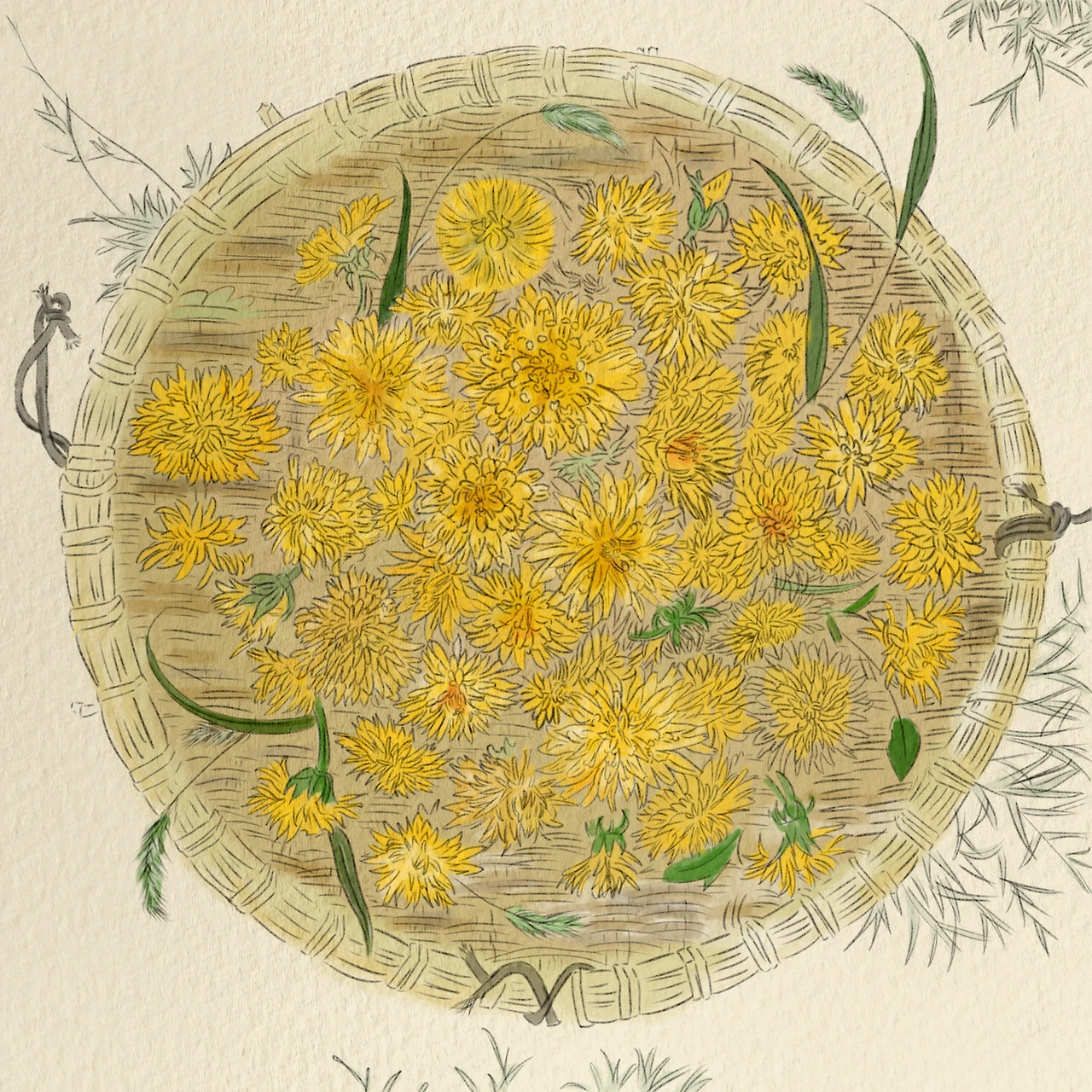스케치 한 시간이 오래 걸려서 채색은 다른 날로 미루려고 했지만 이 그림을 끝내지 않는다면 다른 일들을 할 수 없을 것 같았다. 결국 오전에 3시간에 걸쳐 완성한 스케치를 오후가 되어 또 붙잡게 되었다. 공부를 하고 있는 딸 옆에서 하얀 민들레에 노란빛을 입히기 시작했다. 선으로 이뤄진 채반에 나무 색을 입혀놓고 보니 무엇이든 담을 수 있는 소박한 그릇이 완성됐다. 하나 둘 채워지는 그림이 완성되는 순간 뿌듯함이 나를 감쌌다. 드디어 해냈구나.