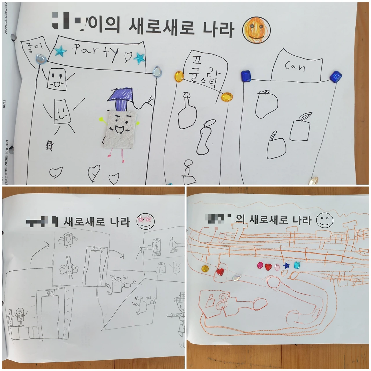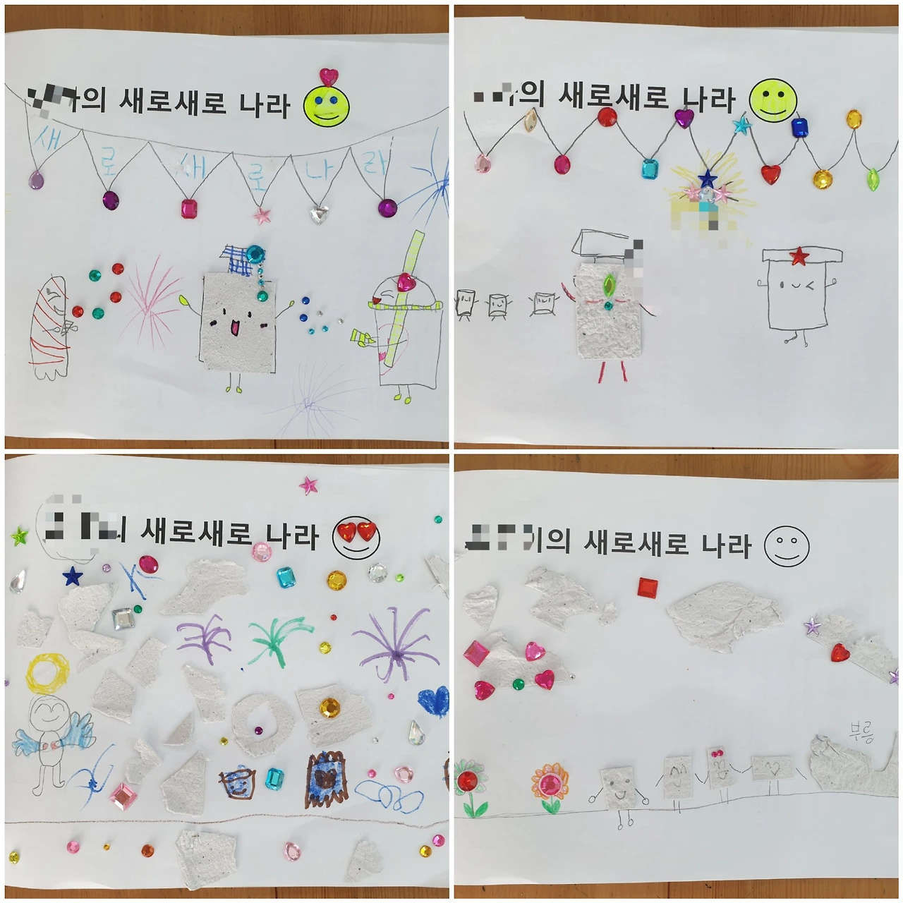 하지만 내가 제일 마음에 들었던 것은 마지막 3주 차 수업이었다. <쓰레기 귀신이 나타났다>라는 그림책을 읽고 독후활동을 했다. 재활용 잘 된 쓰레기가 갈 수 있는 '새로 새로 나라'를 만드는 것이었다. 우리가 직접 만든 재생 종이야 말로 '새로 새로 나라'에 갈 수 있는 자격이 충분했다. 아이들은 자신들이 생각하는 '새로 새로 나라'의 이미지를 그리고 꾸며냈다. 그리고 우리가 만든 재생 종이를 그곳에 넣어주었다.