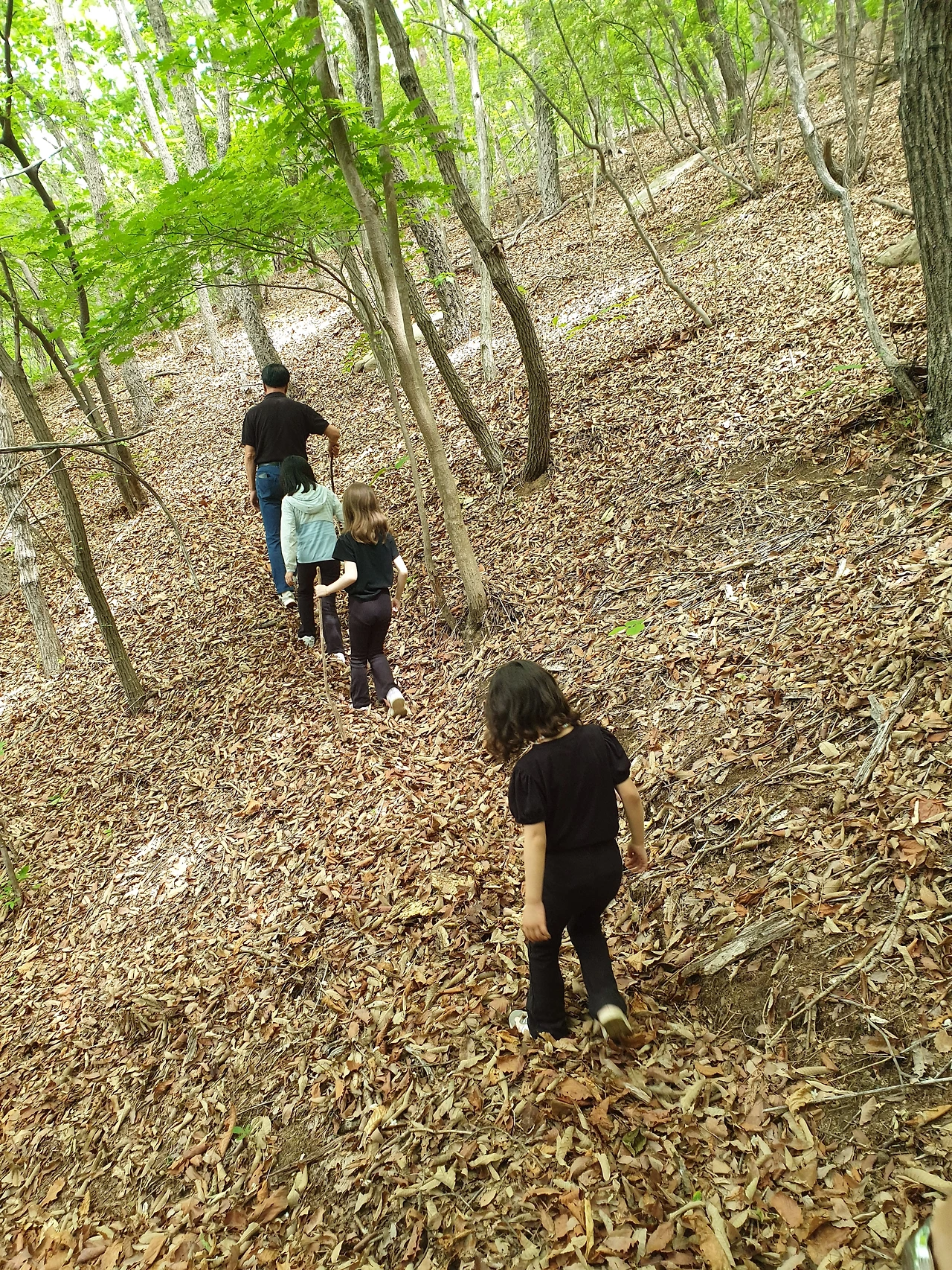 생각보다 막내가 잘 버텨줬지만 낙엽이 쌓이고 경사진 길을 스스로 내려가는 것은 역부족이라 판단됐다. 남편은 오랑우탄이라도 된 듯 막내를 들춰 업고 눈앞을 가로막는 나무들을 제쳐가며 산밑으로 내려갔다.