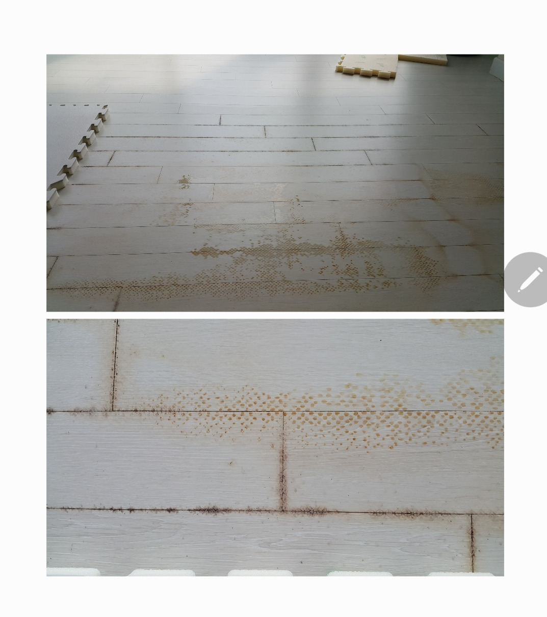 퍼즐 매트를 깔아 놓은지라 틈새로 빗물이 스며들어 간 것을 감지하고 매트를 들어 올렸다. 순간, 보고 싶지 않은 동반자를 마주하게 되었다. 매트 아래로 곰팡이들이 강마루 위에 자리 잡고 있는 것이었다. 이 또한 잘 된 일이었다. 덕분에 곰팡이가 더 퍼지기 전에 깨끗하게 청소할 수 있는 기회를 얻었으니 비 오는 날 창문을 열어두고 나간 내가 기특하기까지 했다.