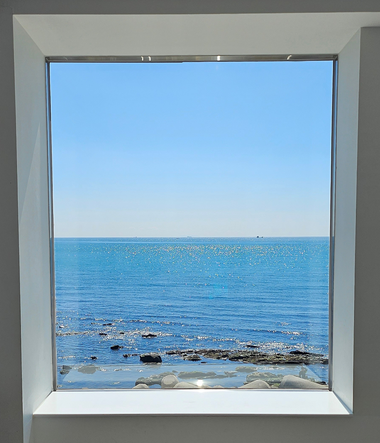 통 창 옆으로는 액자 형식의 창이 있었다. 날씨가 유난히도 좋았던 명절의 바다는 카메라로 담지 못하는 아련한 아름다움을 간직하고 있었다. 명작 앞에서 나오는 나지막한 탄성을 지르지도 못한 채 마냥 그 앞을 떠나지 못했다.