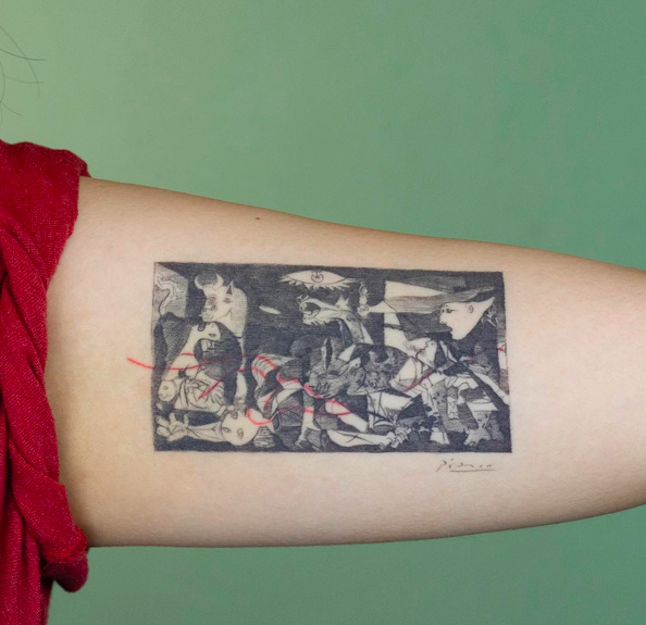 그런 사람이 되고자 했던 걸까? 이 작품을 몸에 새겼다. 피카소의 사인과 함께. 근데 타투의 사진을 보면 안에 붉은 선이 있는데, 이 타투는 사실 커버업(cover-up) 타투다. 마음에 들지 않는 도안의 타투를 받았다가 후회하고 이 타투로 덮었다.
