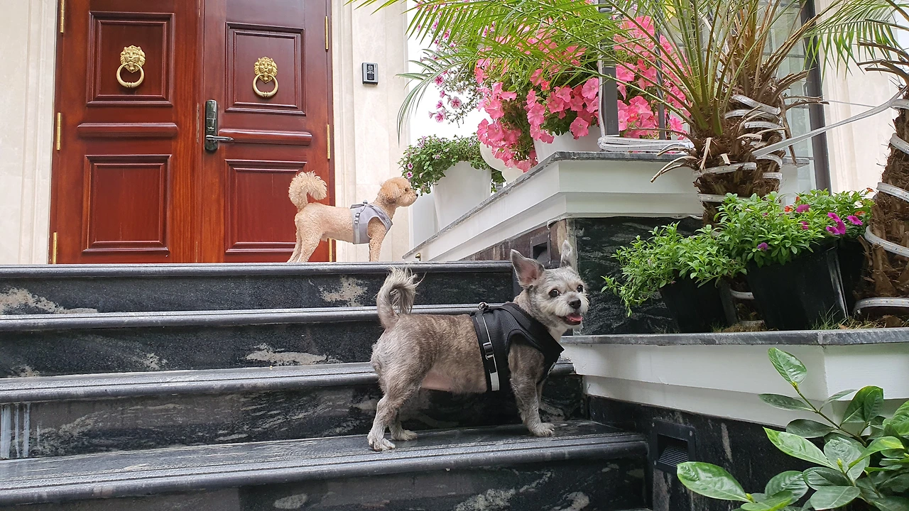 처음으로 강아지 두 마리를 동시에 산책해야 하는 난관에 부딪힌 것이다