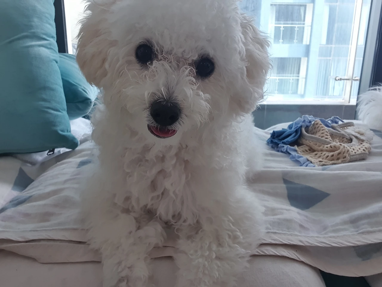 바닥에 있던 초코가 침대로 껑충 올라왔다