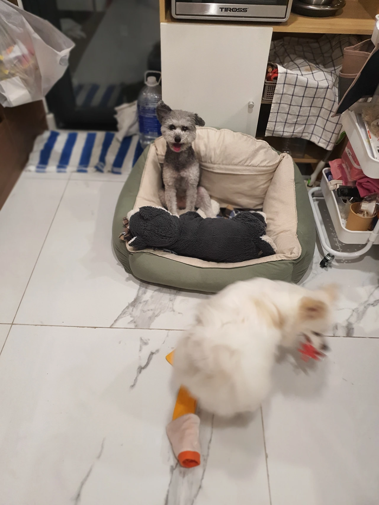 나의 가슴에 안겨 집으로 들어온 잭슨을 본 초코와 쪼니는 새로운 친구의 호기심에 신이 났다