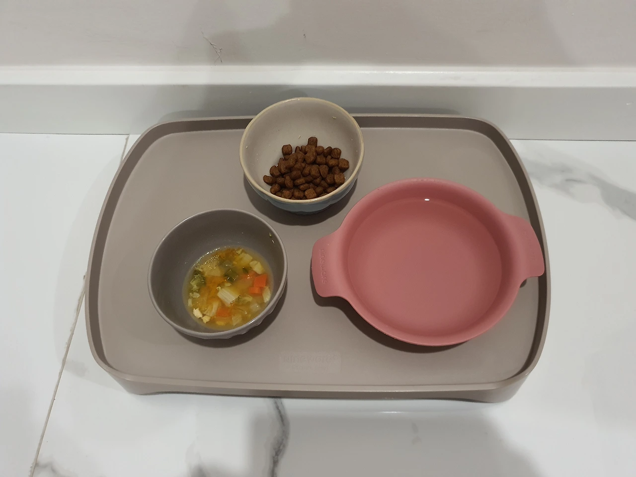 버디가 오면 웰컴 간식으로 주려고 만든 따끈따끈한 화식을 그릇에 담아 초코와 함께 주었다