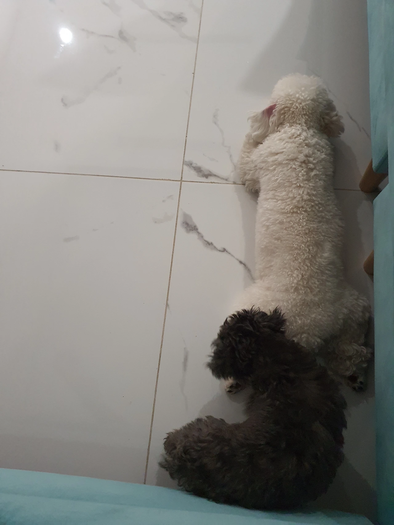 송이가 벌러덩 두러 누워 쓰러졌다가도 푸딩이 바로 바닥에 납작 엎드려진다