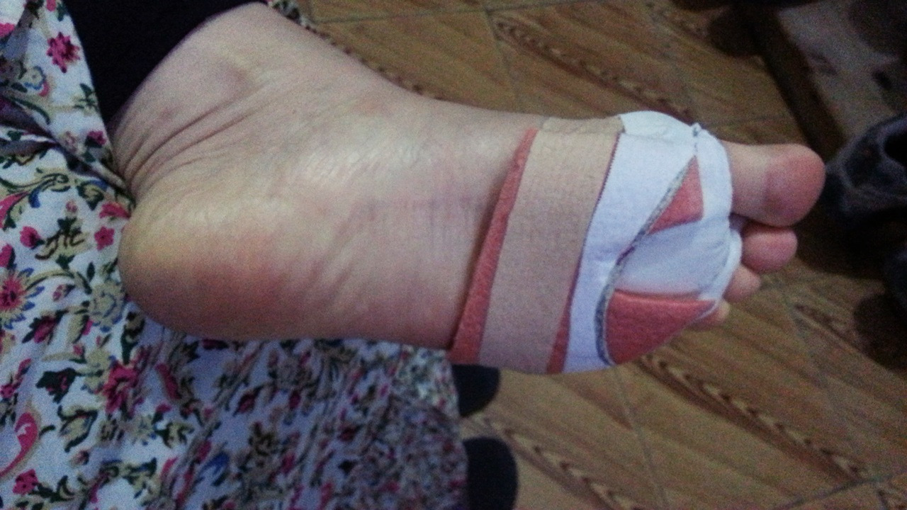 ▲ 호스피탈레로 호세가 치료해준 발 스티로폼으로 상처가 심한 부분에 부담이 가지 않게 처지해주었다ⓒ 정효정