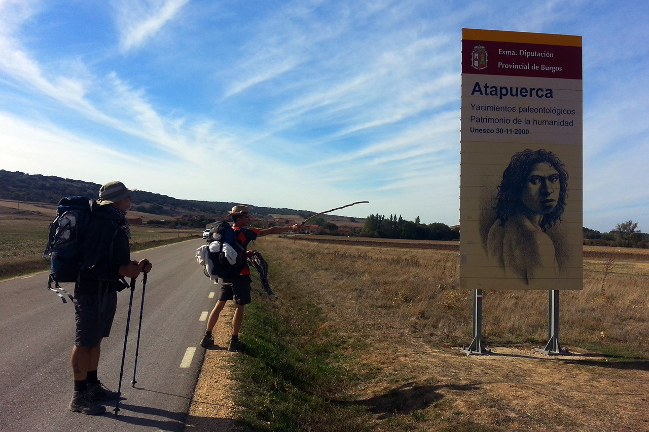 오늘의 목적지는 아따뿌에르까(Atapuerca)다. 이 마을은 80만 년 전 살았던 호모 엔티세서(Homo Antessor)가 발굴되어 세계 문화유산으로 등록되었다. 넓은 해바라기밭 사이로 호모 앤티세서의 얼굴이 그려진 입간판이 세워져 있었다. 우리는 수염으로 덥수룩한 얼굴이 이탈리안 순례자 미첼 같다고 놀렸다.