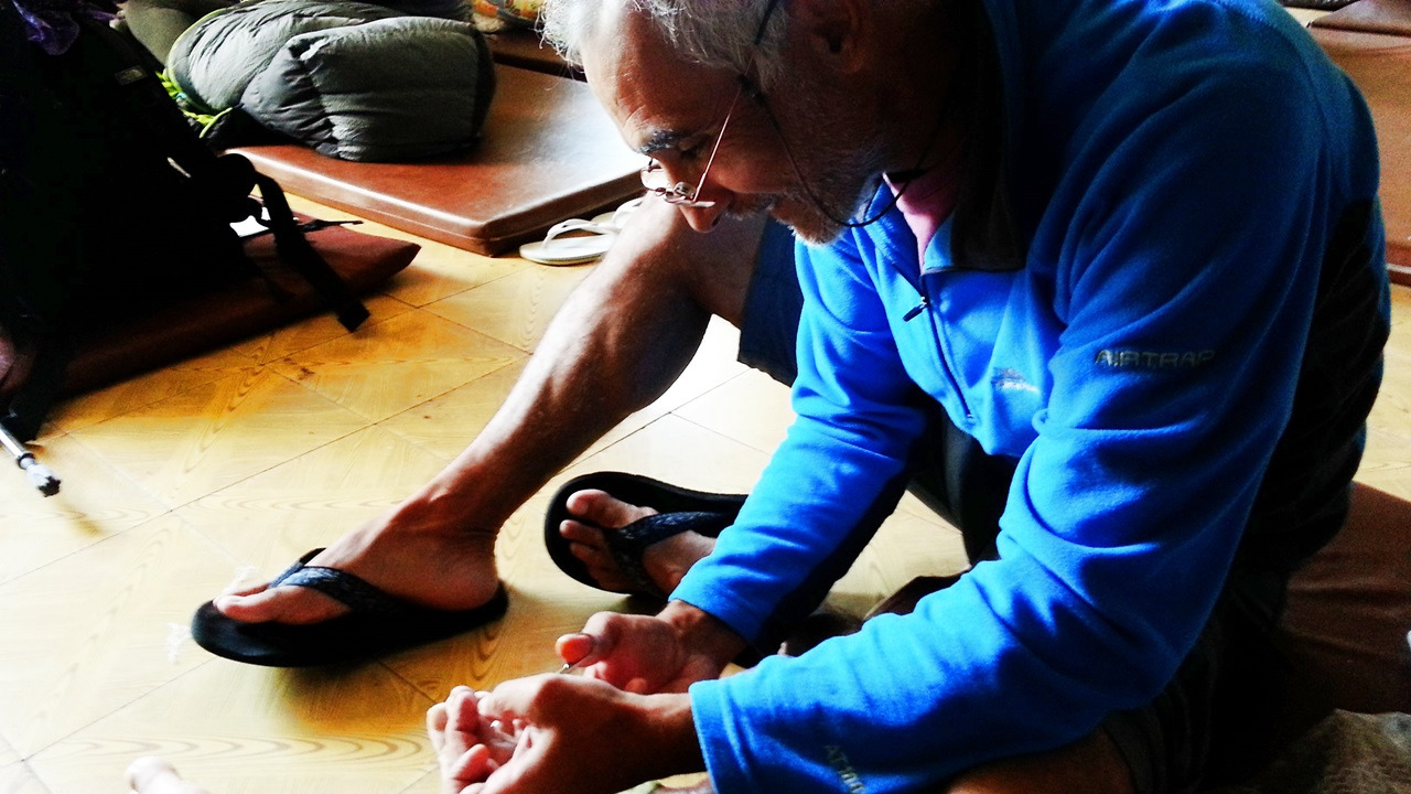 ▲ 내 물집을 치료중인 주옹 거의 외과의사와 같은 집중력으로 물집을 집도 했다ⓒ 정효정