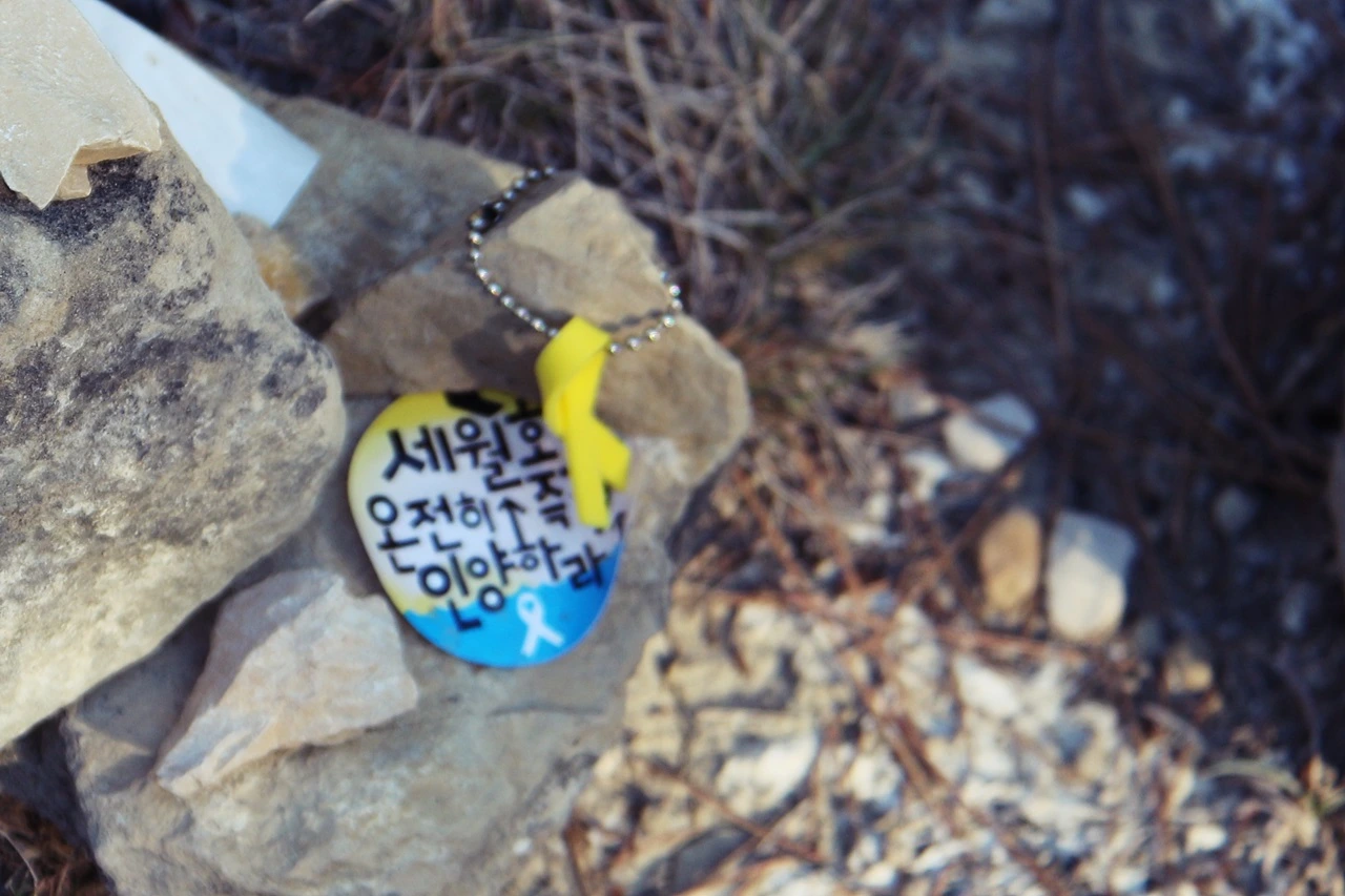 ▲ 순례길에서 만난 메시지 누군가 배지와 노란 리본을 두고 갔다ⓒ 정효정