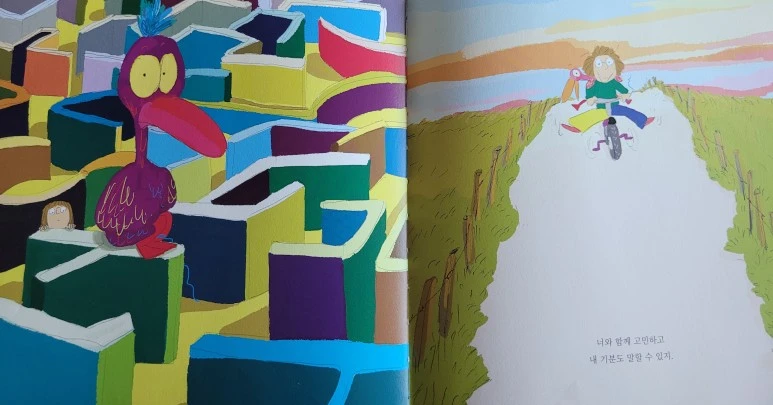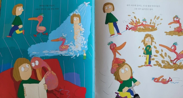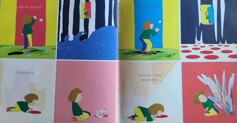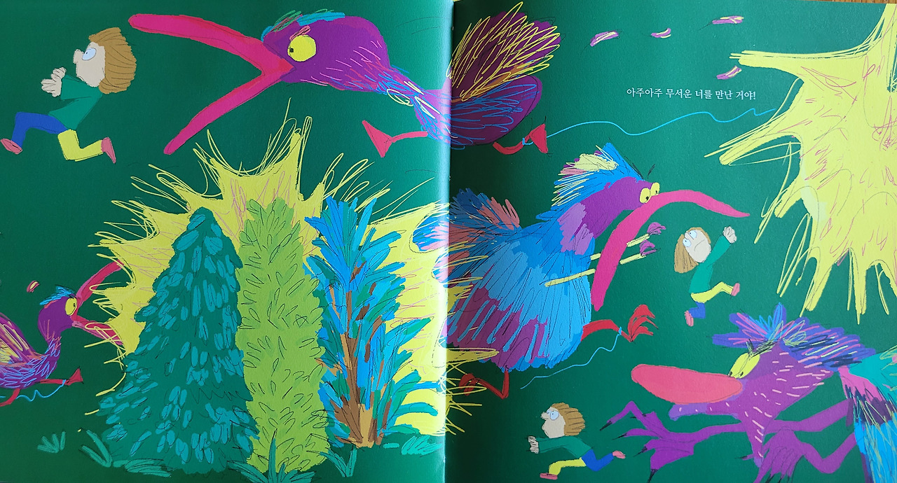 무서운 모습을 하고는 내가 숨은 곳곳 따라다니며 나를 찾아냅니다. 아이는 마침내 오리의 모습을 한 무시무시한 녀석을 피해 작은방으로 들어갑니다.
