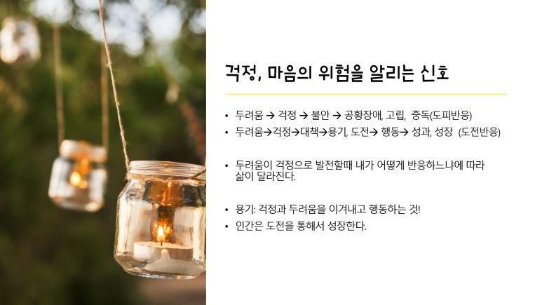 반면 걱정이 내 마음에서 올라오는 순간 조금은 용기 내어 동기를 부여하고 행동한다면 새롭게 한 걸음 나아가는 성장의 도구로 쓰일 수도 있습니다. 결국 도전이란 행동도 두려움과 걱정에서부터 시작되어 나를 움직이게 만드는 원동력이 되는 것입니다.