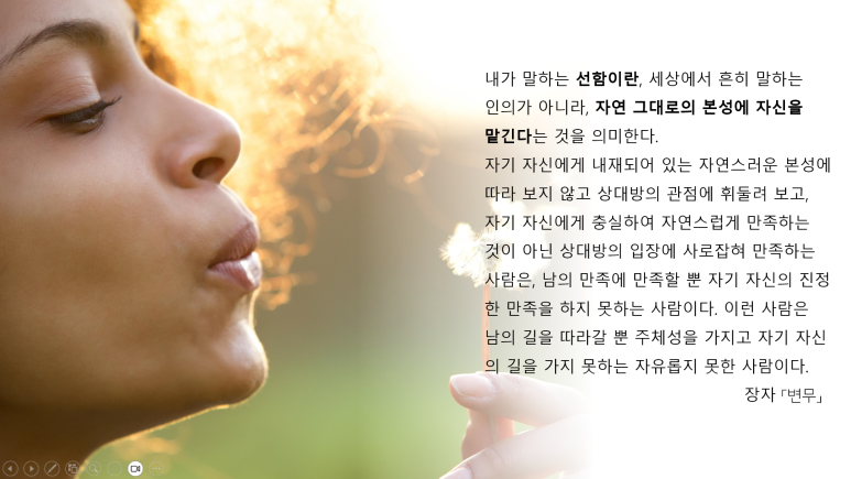 선함이란 도덕적 기준인 인의를 잘 지키는 데 있는 것이 아니라, 자연 그대로의 본성에 자신을 맡기고 주체성을 지닌 채 자기만의 길을 걸어가는 데 있다고 말입니다.