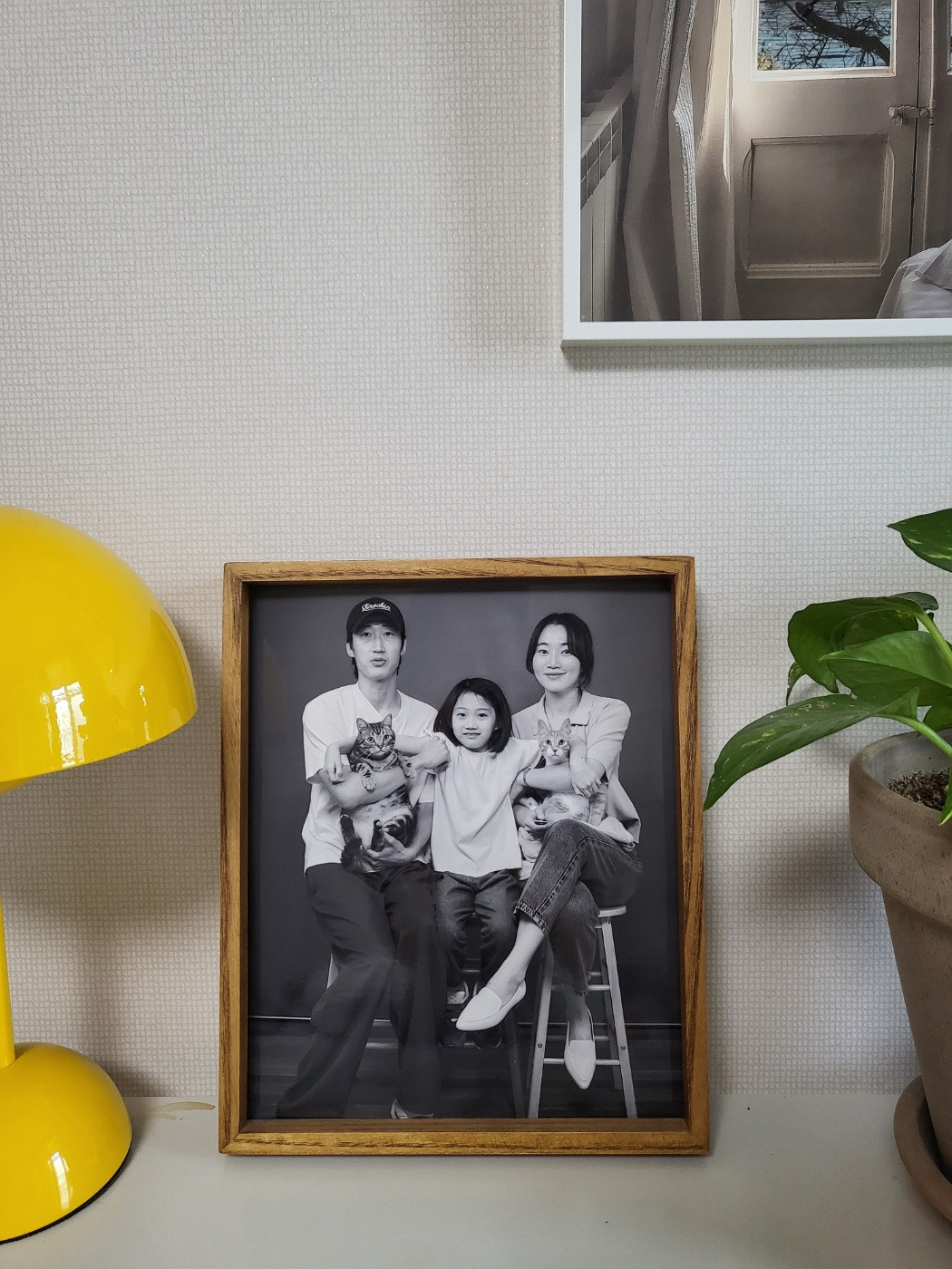 누구는 웃었고, 누구는 무표정이고, 누구는 초점이 다르다. 그러나 고양이 두 마리만은 또렷하게 화면을 응시하고 있다. 우리는 그 사진을 골랐다. 나는 올해의 가족사진으로 이 사진을 인화해 우리의 침실 액자에 걸어 두었다. 매년의 가족사진이 달라진다. 자그마했던 아이가 조금씩 커져가고 가족 구성원도 하나씩 늘어간다. 올해의 가족사진은 3인 2묘가 핵심이고 그래서 고양이들이 메인이다. 셀프 가족사진에서 매년 똑같은 사진은 없다.