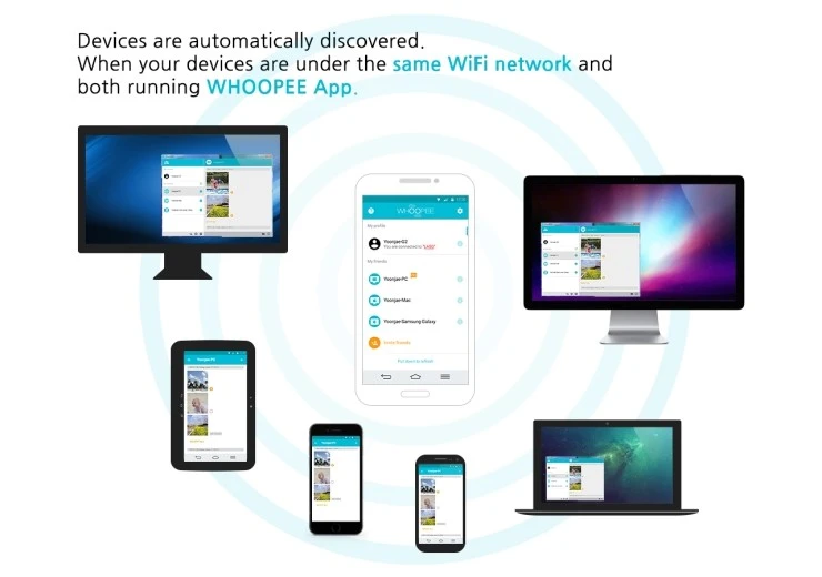 WHOOPEE는 안드로이드, iOS, Mac, Windows 등 모든 디바이스에서 사용 가능합니다.