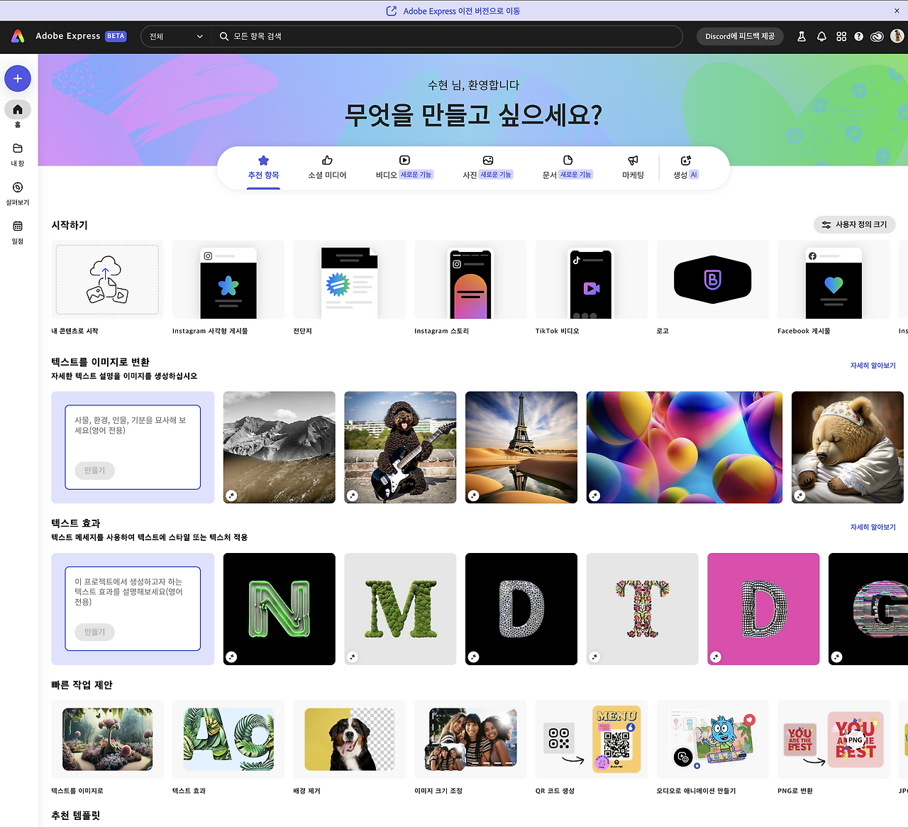 아래는 내가 주로 브랜드 콘텐츠 기획을 할 때 사용하는 사이트들이야. 먼저 Adobe Express는 내가 디자이너가 아닌데 여기서 작업한 결과물은 항상 좋은 피드백을 받았어. 포스터, 초대장, 디자인이 들어간 문서 등을 작성할 때 매우 유용하게 사용하고 있어. 심지어 얼마 전 새로운 버전의 익스프레스가 등장해서 AI입력값으로 디자인을 만들어낼 수가 있어. 무궁무진하게 활용하기 좋은 사이트야. (유료)