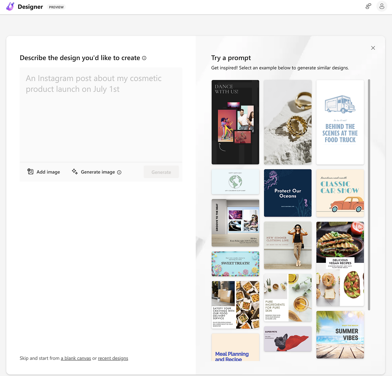 세 번째는 Microsoft Designer 야. 글을 써주면 디자인 작업을 해주지. 역시 매우 유용하게 사용하고 있어.