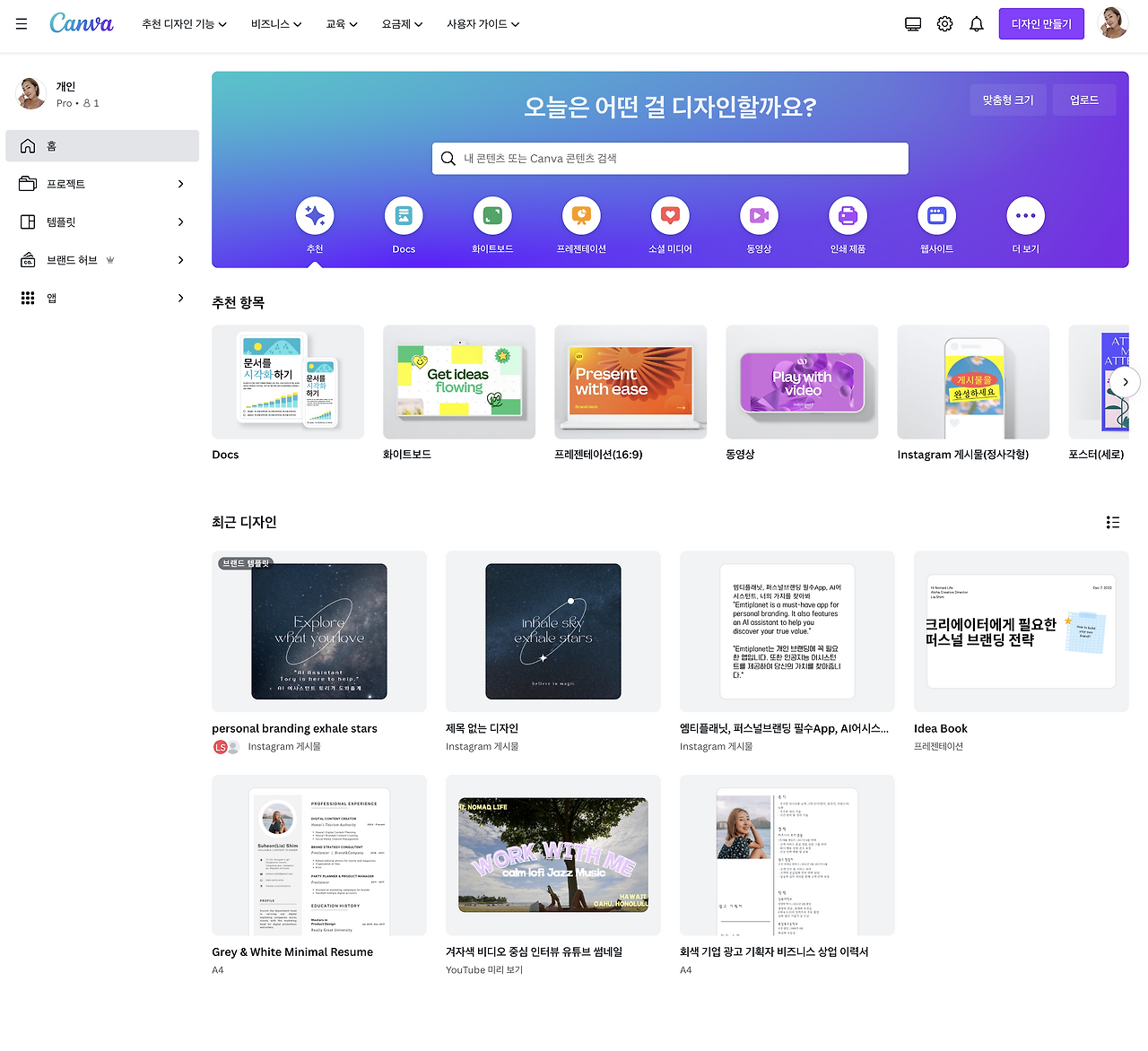 두 번째는 최근 가장 많이 사용하는 canva 야. 여긴 디자인이 정말 좋고 특히 콘텐츠를 제작하기에 너무 편해 SNS 콘텐츠 제작에 특화되어 있는 것 같아 프로 무료 사용 중이야.