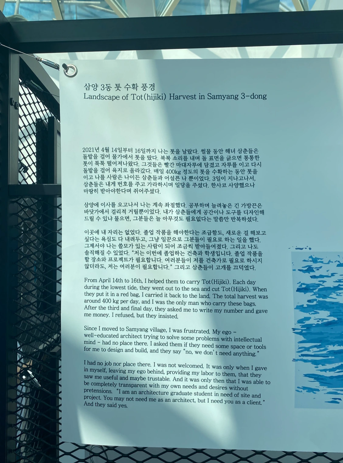 박물관에서 제주해녀 문화와 건축프로젝트 전시를 봤다. 프로젝트의 작가는 해녀삼촌들에게 새로운 공간이나 도구를 디자인하려 했다. 그러나 해녀 삼촌들은 늘 "아무것도 필요 없다." 했다. 졸업작품을 해야 하는 작가의 입장은 난처했을 것이다. 그러나 새로운 것을 해보겠다는 욕심을 접고, 해녀삼촌들을 도우며 그 문화를 이해했을 때, 조금씩 받아들여질 수 있었다고 한다. 학교에서도 삼촌들을 보면 몇 가지 도구와 몸 말고 아무것도 필요로 하지 않으신다. 바닷속에서도 더도 아닌 할 수 있는 만큼만 물질을 하신다.