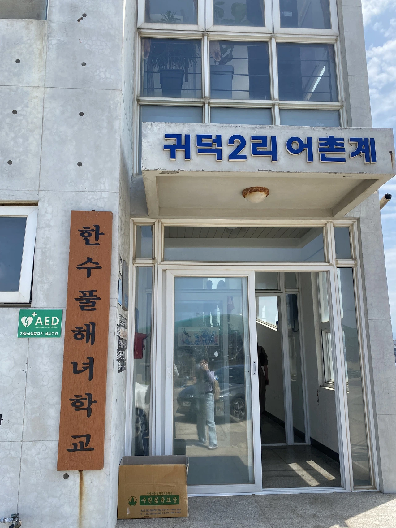 입학식날, 떨리는 마음으로 버스를 타고 귀덕2리 사무소로 향했다. 창문으로 부는 바람이 부드러웠고, 빛나는 에메랄드색 바다가 아름다워 보였다. 가는 길에는 '보통의 오늘'과 'LONG ROAD'라는 간판이 있었다. 평범한 어느 긴 여정을 시작하는 날 이 단어들이 보게 되어 기분이 좋았다.
