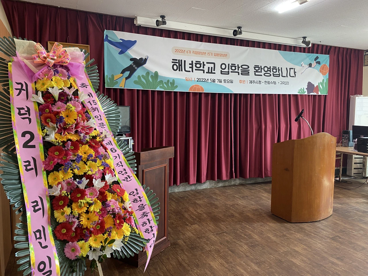 가는 길에 만나는 분들과 가볍게 인사를 나눴다. 처음에는 낯을 가릴까 걱정했지만, 신기하게도 어색하지 않게 사람들과 자연스럽게 대화했다. 입학을 축하하는 해녀가 그려진 플래카드와 함께, 제주도 사투리가 흥겹게 들리는 입학식이었다.