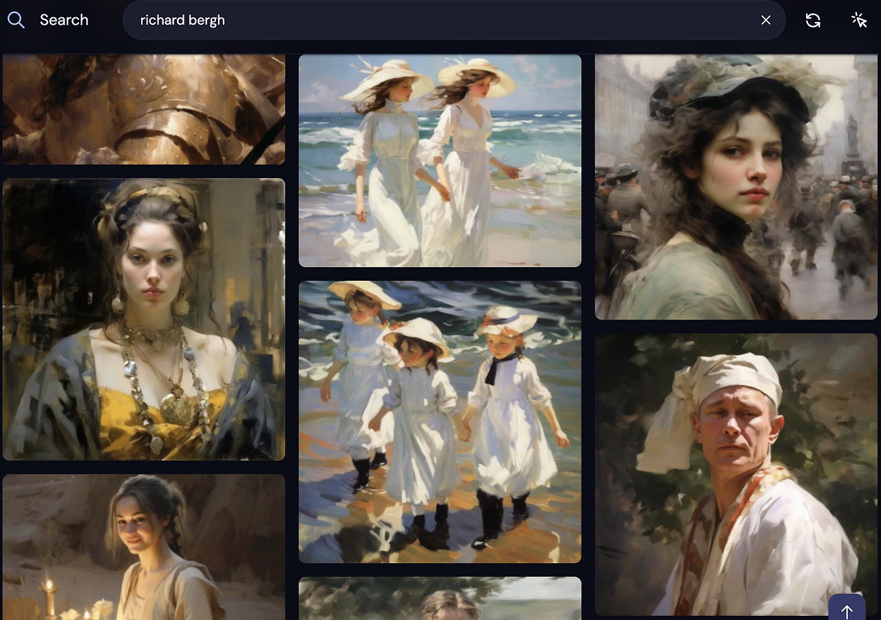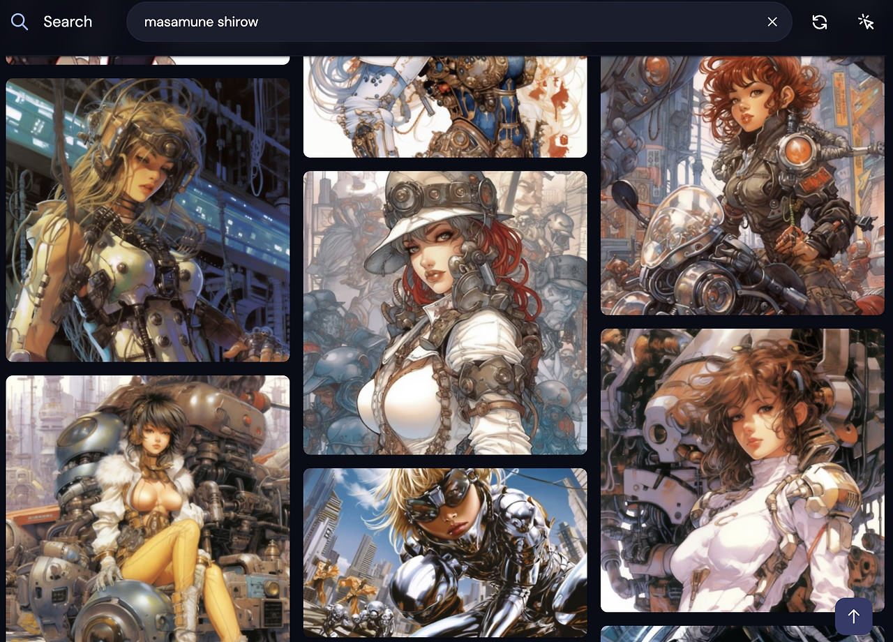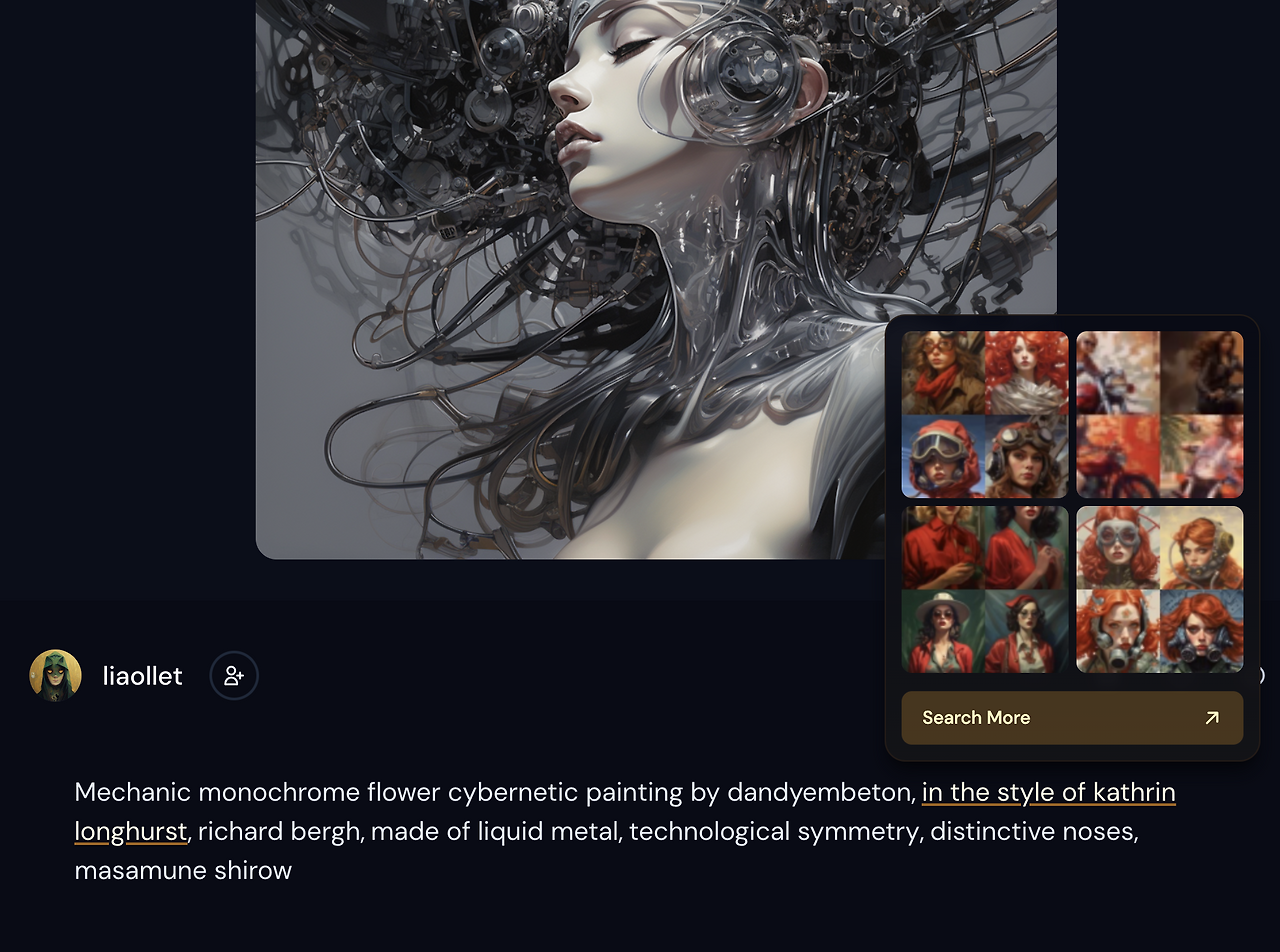 이 작품을 만들기 위해 PromptHero를 참고했고, 생각하지 못했던 키워드를 골라 프롬프트를 작성했다. 주로 그대로 생성해 보고, 조금씩 원하는 방향으로 내용을 추가하거나 제외했다. 작가 스타일을 한눈에 보고 싶다면, 미드저니 프로필에서 스케일업 시켰던 이미지의 프롬프트를 다시 보기 하면 된다. 작가의 이름에 커서를 대면 그 작가의 스타일과 비슷하게 제작된 다른 그림들도 볼 수 있다. 더 자세히 알고 싶다면 구글에 검색해 보기도 한다. 알지 못했던 작가나 스타일의 합이 새로운 그림을 낳는다. 위 작품의 경우는 세 가지 아티스트의 조합이 들어갔다.