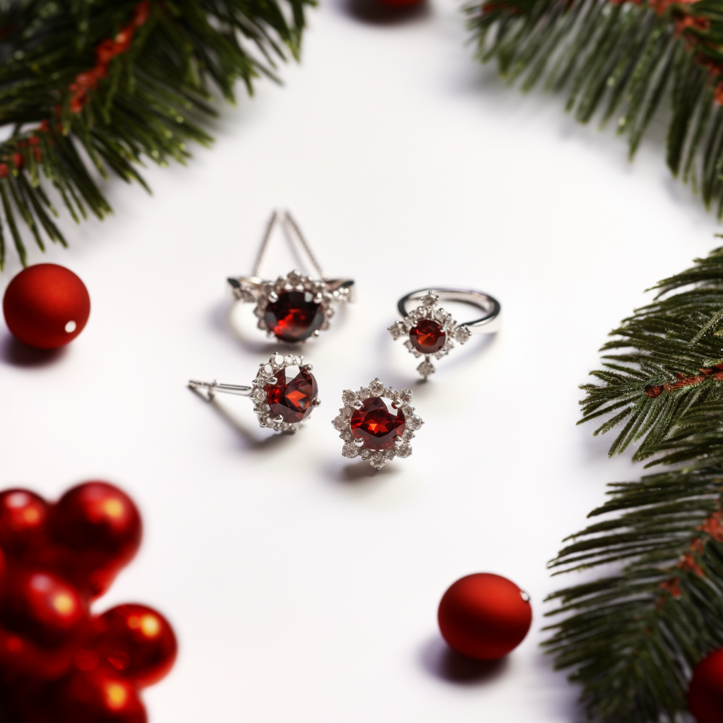 위 주얼리 디자인의 프롬프트는 ( Set of garnet rounded edge star jewelry, garnet, red allure garnet and small moissanite gem stone, minimal style, haute couture, fashion, studio lighting, commercial photography, white background, round soft edge )이다.