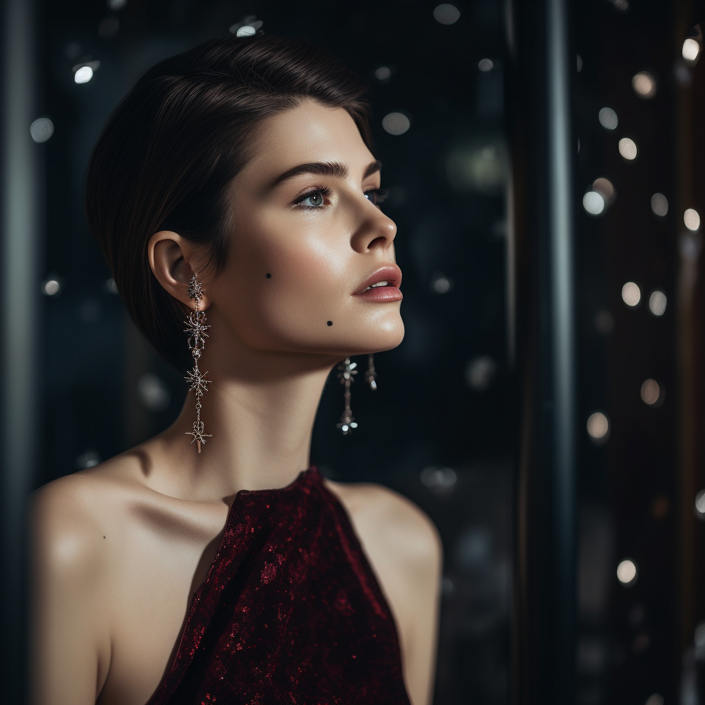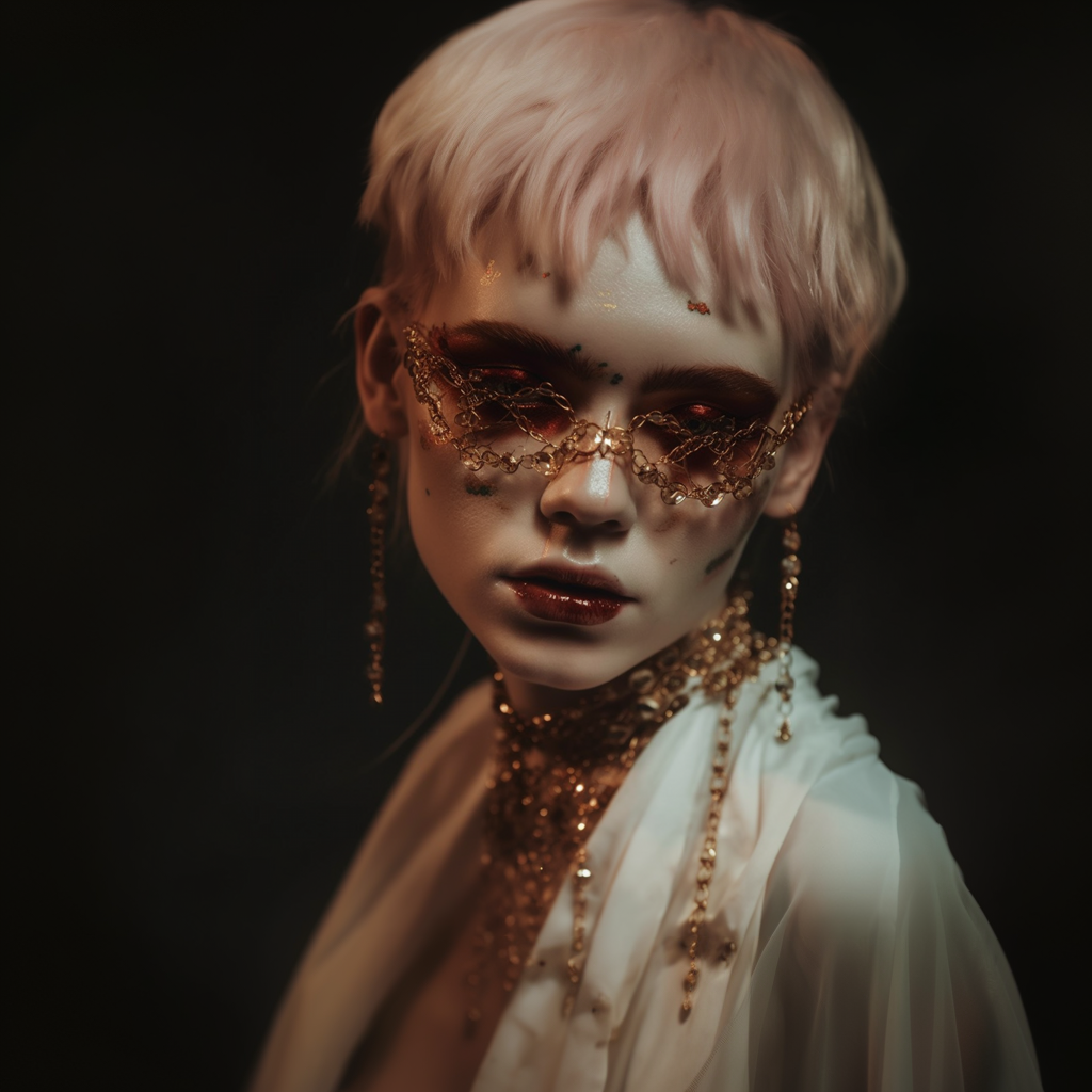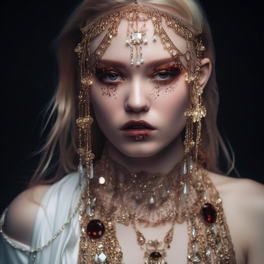 위 컨셉 이미지 프롬프트는 ( white crystal and garnet gemstones face jewelry with crystal harness, ethereal esthetic, haute couture, fashion megazine, shimmering glossy wet iridescent gold bronze multichrome makeup textures, christmas backgroud )이다.