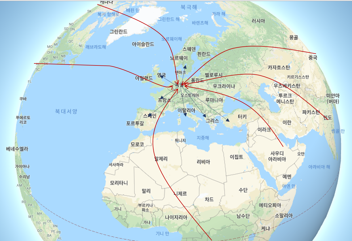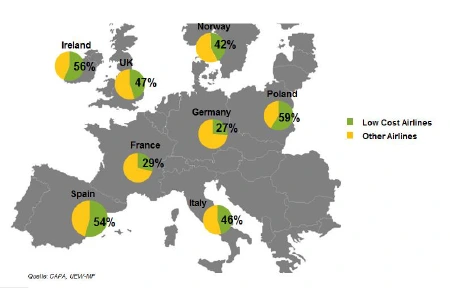 출처:FRAPORT Visual Fact유럽 내에서 이동하는 비행기 중 44%는 LCC다. 2013년에 이후 5년 만에 점유비가 9%가 증가했다. 영국, 스페인, 이탈리아, 북유럽쪽은 전체 항공사 중 LCC의 비중이 거의 50%에 육박한다.