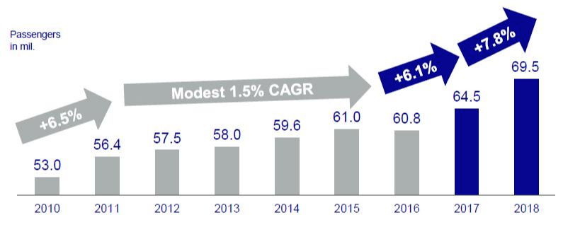 최근 이 거대 허브 공항에 변화의 바람이 일어나고 있다. 바로 유럽 내 여행수요의 증가로 항공수요가 급증하고 있다는 점이다. 프랑크푸르트 공항의 승객수도 최근 2년간 금융위기 이후 큰 폭의 증가세가 일어나고 있다. (2017년 +6.1% 증가, 2018년 +7.8% 증가)