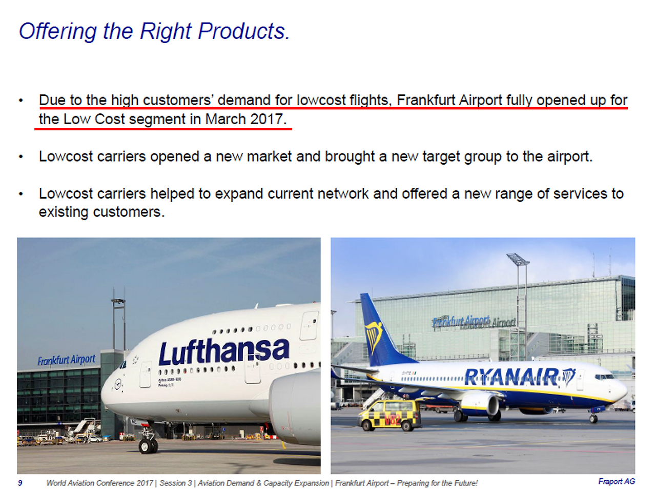 출처:WAC 2017프랑크푸르트 공항도 트렌드에 더 이상 뒤처지지 않기 위해 2017년 3월 LCC를 위한 게이트를 오픈했다. 프랑크푸르트 공항은 허브 공항으로서 최대한 많은 승객을 모아서 대륙 밖으로 멀리 보내는 것에 집중하다가 전략을 변경한 것이다. 더 이상 LCC가 가져오는 승객 증가를 무시한다면 경쟁에서 뒤처질 것이라는 우려에서였다.
