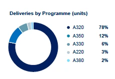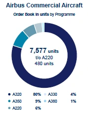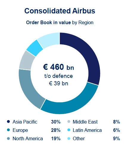 2018년 말 기준, 에어버스 그룹 지역별 매출 현황. 출처:AIRBUS 2018년 기준, 에어버스 수주 잔고[좌측]와 에어버스의 비행기 인도 현황[우측]. A320 모델이 대부분이다.