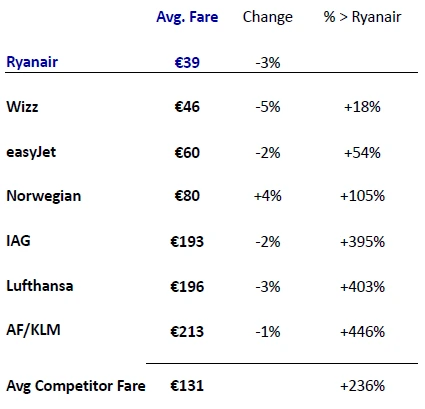 18년 말 기준, 평균 판매단가표. 출처 라이언에어