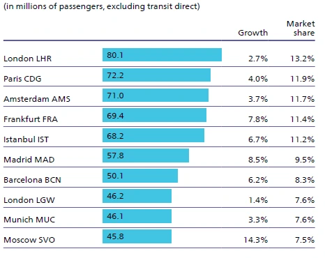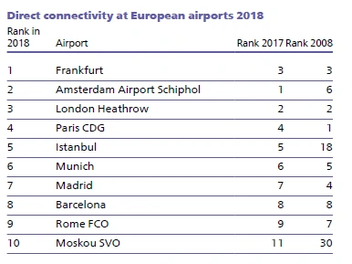 2018년 기준, 프랑크푸르트 공항은 약 6,950만명의 여객수를 기록했고 유럽에서 4번째로 승객들이 붐비는 곳이다. (인천공항은 2018년에 약 6,826만명의 여객수를 기록했다)