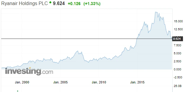 빈 항공 주가 추이반면 항공기 제조사와 공항은 이득을 보고 있는데 LCC를 비롯한 항공 업체는 과당 경쟁으로 손실을 보고 있다. 아래의 표는 유럽 내 LCC 업계 1위 라이언에어가 제공한 주요 항공사 평균 판매 가격인데 업계 1위가 적극적으로 판매단가를 낮춰 점유율을 높이려고 하니 다른 업체들도 덩달아 평균 판매 가격을 떨어뜨리고 있다.