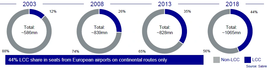 출처 ACI 2017년에는 유럽은 아시아에 이어 두번째로 높은 성장률인 +8.8% 승객 증가를 기록했고 2018년에는 전년비 +6.1% 증가했다. 프랑크푸르트 공항 승객의 64%는 유럽 대륙에서 온 승객들이고 36%만이 미국, 아시아 등 유럽 외 승객들이다. 18년 기준, 유럽 승객들의 증가율은 +10.8%로 유럽 외 승객 증가율 +2.8%를 훨씬 뛰어넘는다. 왜 그럴까?