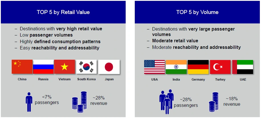 출처:스키폴 공항 annual report환승고객이 중요한 이유는 이들이 공항에 머물면서 소비를 한다는 것이다. 환승객의 75%가 유럽 외에서 온 고객이다. 이들이 공항에 머물면서 면세점 소비를 주로 하는데 아래의 표는 인당 소비금액 TOP5 나라와 매출에서 차지하는 금액이 큰 TOP5 나라다.