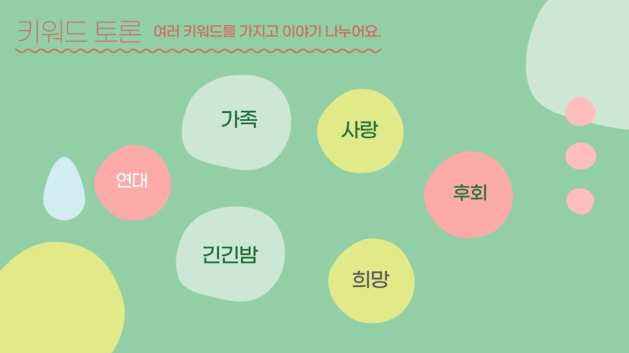 이제 아이들은 이야기가 대충 떠오른 것 같았다. 몇 가지 키워드를 주고, 이 키워드에 대해 이야기해보기로 한다.