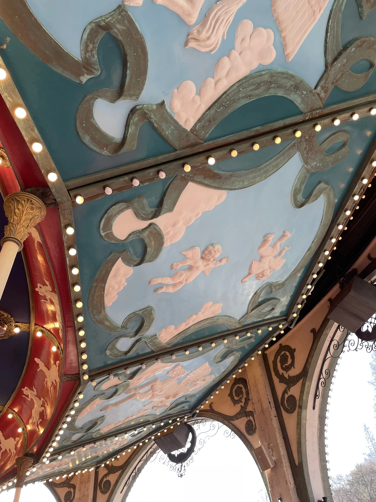 놀이기구 타느라 밥도 못 먹고 발을 동동거리던 중학교 때 이후로 20년 정도가 흘렀는데, 놀랍게도 놀이공원의 구성은 크게 변한 것이 없다. 좁은 입장문을 통과하면 있는 너른 광장과 집에 가기 전 아쉬워서 몇 번을 더 타는 바이킹, 무섭고 재밌는 놀이기구가 많은 구간 모두 그대로다. 그나마 내 기억에 크게 달라진 점은 T익스프레스가 생긴 것과 낡은 관람차가 멈춘 것이다. 운영을 멈추자 그 흔적조차 없어진 ‘독수리요새’에 비해 무지개색 관람차는 파리의 에펠탑처럼 에버랜드의 랜드마크가 되어있다. 클래식은 영원하다던가, 어떤 분야의 고전이 되어 시간의 흐름에도 흔들림 없이 그 자리를 지키는 일엔 경외감이 든다. 회전목마도 그중 하나다.