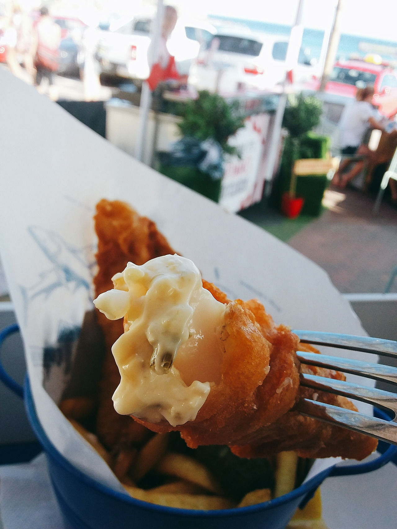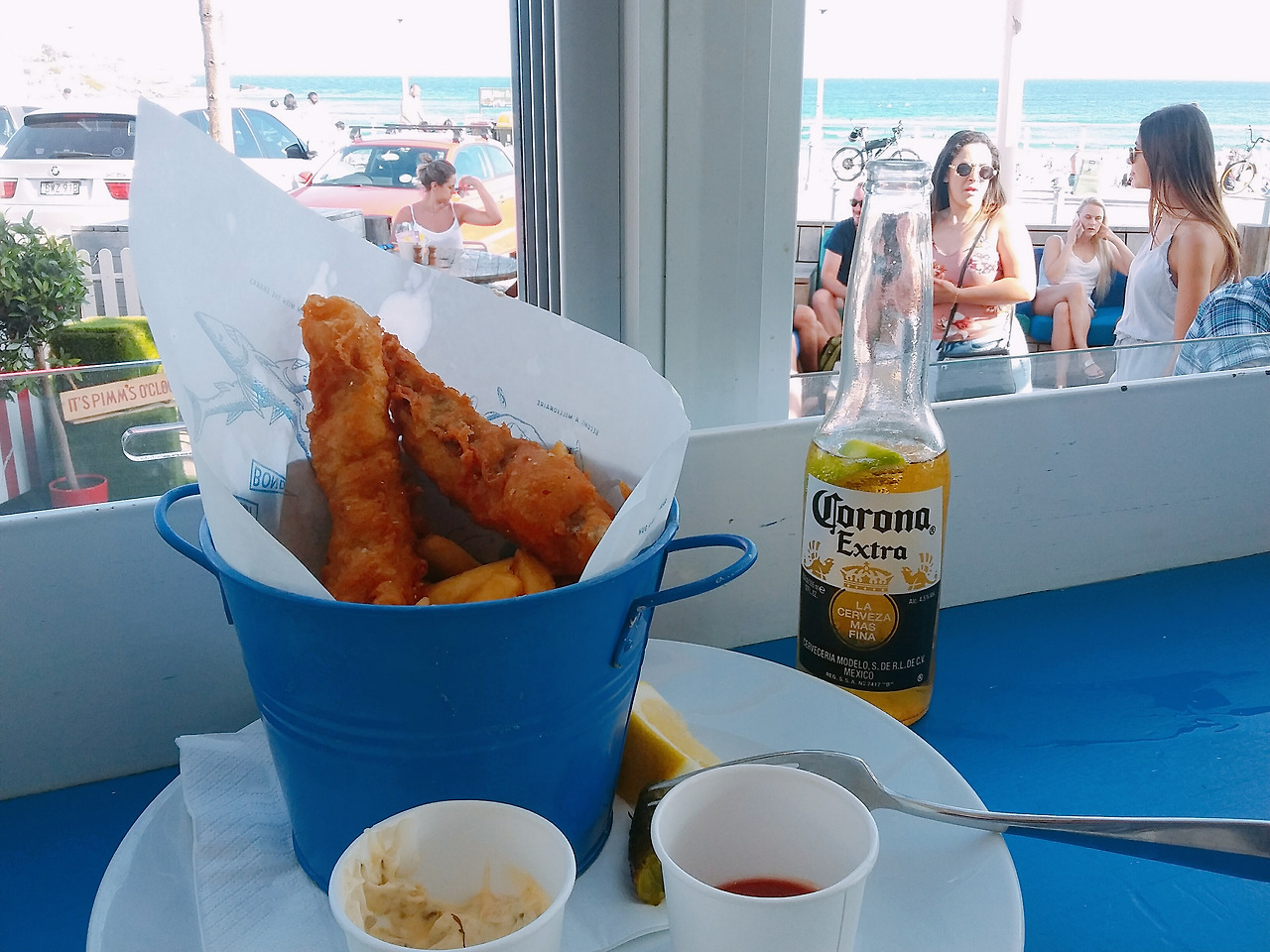 그리곤 이동 중에 검색해본 버킷리스트에 도착하였는데, 식당이라기보다는 펍에 가까운 그곳은 가게를 울릴만한 큰 음악소리와 사람들의 말소리로 정신이 없었고 그런 연유로 다소 들어가기가 망설여졌던 나는 가게 주위를 잠시 돌아보다가 이내 용기를 내어 가게 안으로 들어갔다. 바에서 코로나 한 병과 피시엔 칩스를 주문한 후 바다가 보이는 곳에 운 좋게 자리를 잡은 나는 음식이 나오고, 갓 튀겨진 피시엔 칩스를 맛보자 속으로 감탄할 수밖에 없었다. 입안에서 생선 살이 사르륵 녹는 것이, 전에 맛보았던 다른 튀김들보다도 훨씬 부드러웠달까. 정확히 표현하자면 생선 살이 바스러지는 것이 아닌 녹는 것에 가까웠다.