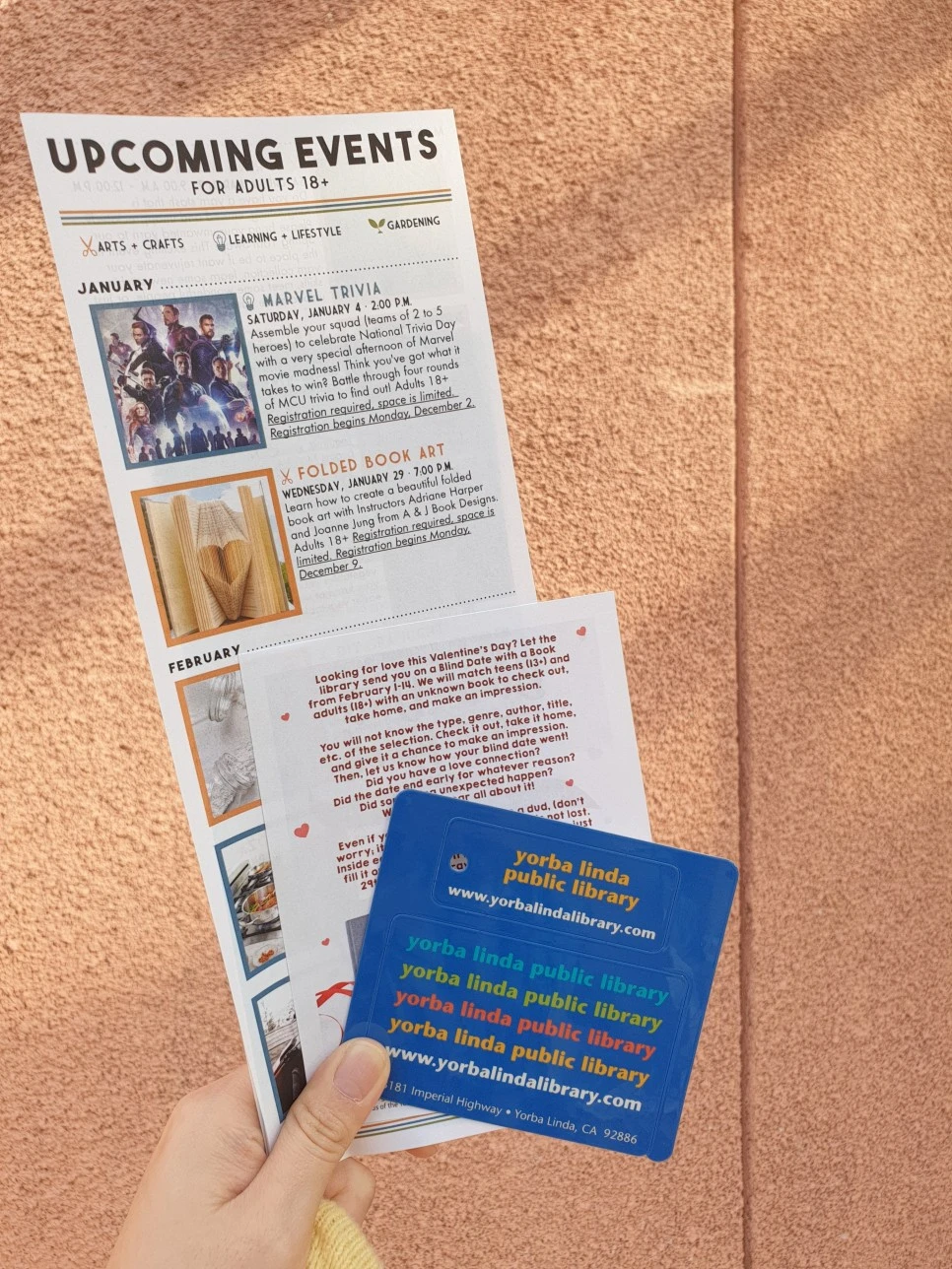 떠나기 전 도서관에서 하고 있는 행사팜플렛들을 몇 개 받으며, 요바린다 시민들만 가질 수 있는 도서관 대출증도 함께 선물받았다. 나만 그런 것인지 몰라도 이상하게도 누군가 문헌정보학과라든지 사서라든지 또는 책과 연관된 일을 한다는 사람이라 한다면 그렇게 몹시 반가울 수가 없다. 나 역시 그러한 이유로 외국도서관 사서선생님들께 큰 환대를 받았고 일반 관광객이었다면 쉽게 얻을 수 없는 선물까지 받았으니. 때때로 이런 일들일 있을 때마다 나는 스스로 사서라는 직업이 좋은 것인지 혹은 사서인 내가 좋은 것인지 헷갈리기도 한다. 중요한 것은 나 스스로 '저 사서예요'라는 자기소개를 할 때 조금이라도 더 떳떳할 수 있도록 직업적인 발전을 이루어야 한다는 의무감을 들게 한다는 것이다. 비록 현재 근무하고 있는 근무지에서 사서로서의 존재감이 미비할지어도. 그 다짐을 잊고 때때로 권태에 매몰될 지어도.