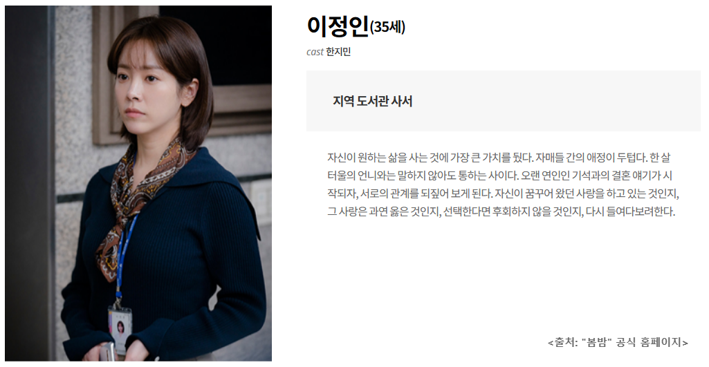 그동안 사서라는 직업이 등장했던 드라마, 영화에 비해 "봄밤"이라는 드라마는 비교적 현실을 제대로 반영한 편이라고 생각했다.
