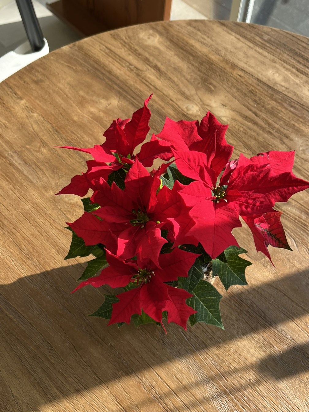 테이블 위에 놓여있던 포인세티아가 풀이 죽어있다.