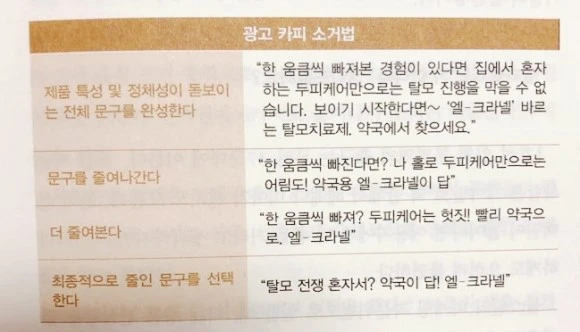 전체 광고 카피를 만든 다음 불필요한 것을 하나씩 제거해 마지막에 굉장히 단순화한 메시지만 전달하는 것(소거법).