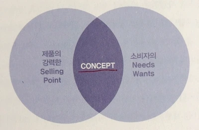 제품의 강력한 세일즈 포인트와 소비자의 필요 혹은 선호라는 두 가지 교집합에서 도출된 것이 컨셉!!