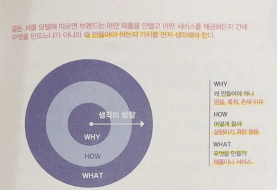 왜 만들어야 하는지 why부터 생각하고 나서 그 가치를 실현하기 위한 방법과 판매할 제품을 구상하는 순서로 일해야 시장을 움직이고 새로운 흐름을 만들어낼 수 있다. 이것이 why-how-what의 골든 서클이다.