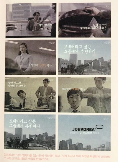 잡코리아는 구인 정보가 가장 많고 다양한 곳 중 하나가 아니라 일 안하고 게으른 직장 상사나 부하 직원을 확실히 다른 회사로 노잴 수 있는 곳으로 광고